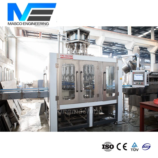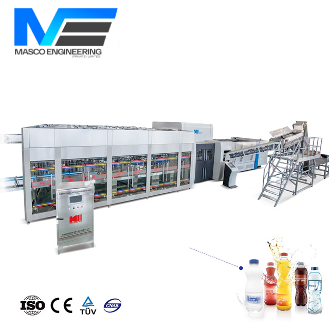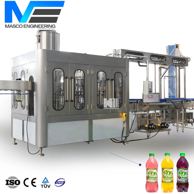 Carbonated drink 3-in-1 filling machine is also well suited for your production line. The three functions of bottle rinsing, filling and capping are composed in one body of the machine. The machine is used in filling carbonated beverage in bottles made of polyester and